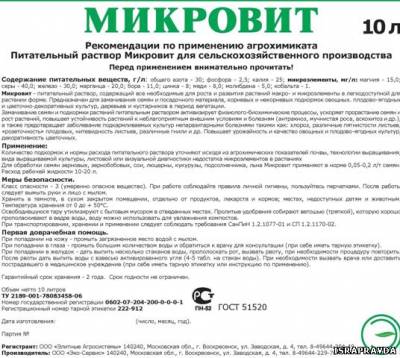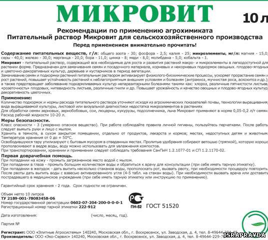 Наша компания является производителем и владельцем торговой марки «Микровит» Микровит это комплекс хелатированых микроэлементов который подходит как для корневой так и внекорневой подкормки и для предпосевной обработки семян. Данный комплекс прошел испытания во ВНИИКХ результат показал повышение урожая на 41%. Расчеты показали что 1 вложенный рубль в последующем дает прибыль до 30 рублей. Микровит выпускается в жидком виде и имеет идеальную растворимость в воде, для опрыскивания подходит любое стандартное оборудование, хорошо абсорбируется на поверхности листа и в почве, длительное время не разрушается микроорганизмами. На данный момент с нами работают сельхозпроизводители с Московской, Волгоградской, Ленинградской, Амурской обл., респ. Марий Эл и многих других областей и регионов и везде Микровит показал хорошие результаты. Фасовка 10 литров 450 рублей литр с НДС. Цена на оптовую поставку обговаривается индивидуально.